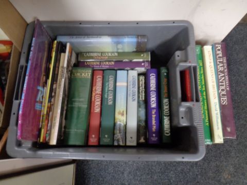 A box of hard back books to include antiques, cricket, Catherine Cookson novels, soft back music books