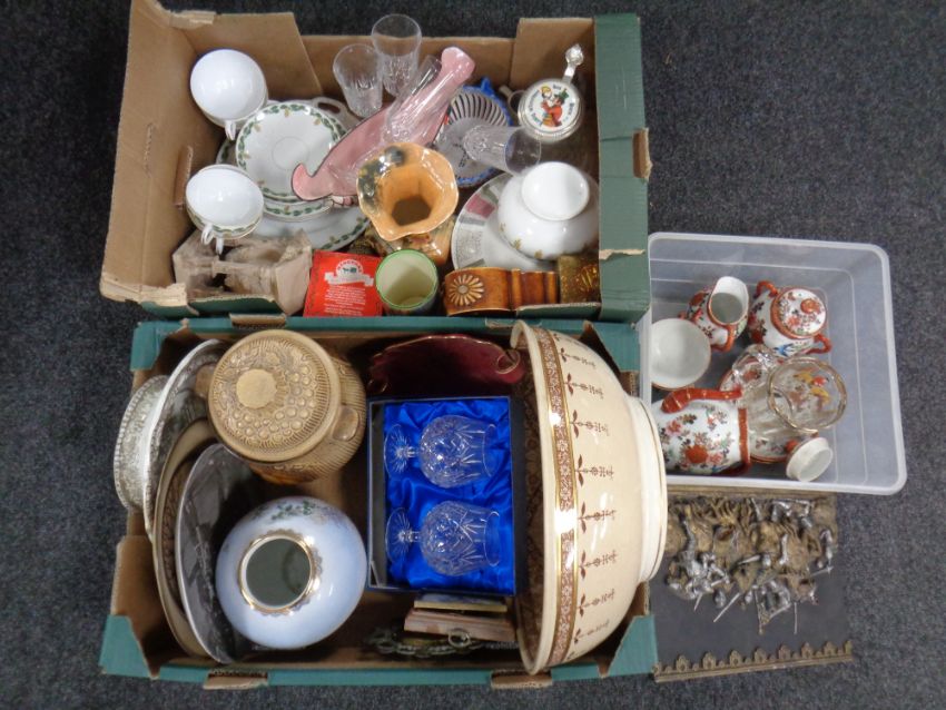 Three boxes containing miscellaneous ceramics to include Maling, Harlequin, Gondola bowl (as found) 19th century wash bowl, Japanese egg shell tea ware, storage jar etc