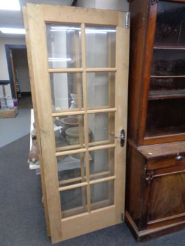 A pair of pine interior doors with glass inset panels, height 198 cm.
