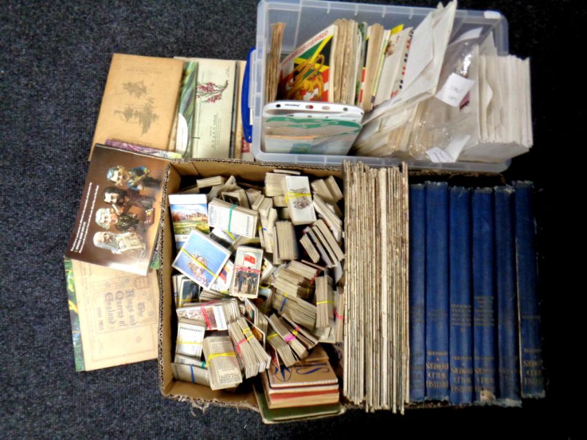 Two boxes containing a large quantity of cigarette cards and cigarette card albums, tea cards, first day covers, Railway Wonder of the World magazines, six volumes: British Wild Flowers