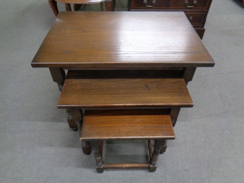 A nest of three tables in an oak finish