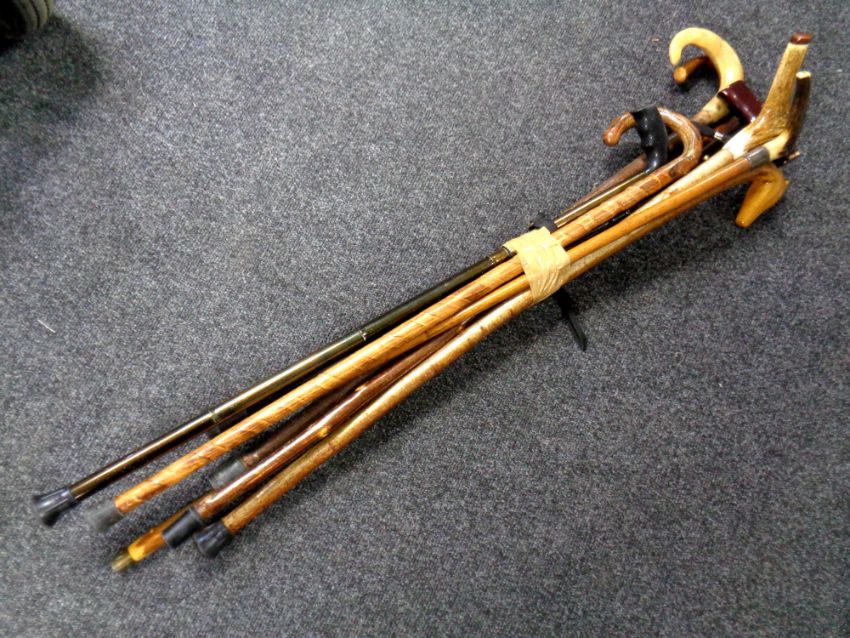 A bundle of assorted walking sticks to include horn handled examples