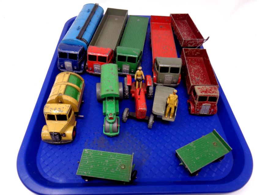 A tray containing mid 20th century play-worn Dinky super toys Die cast models including Foden flat bed trucks, Bedford lorry etc