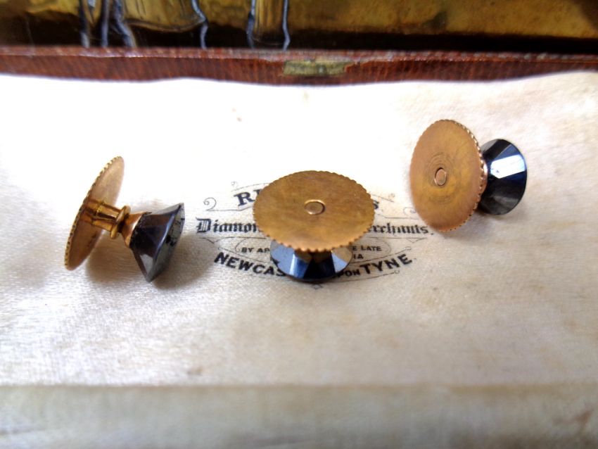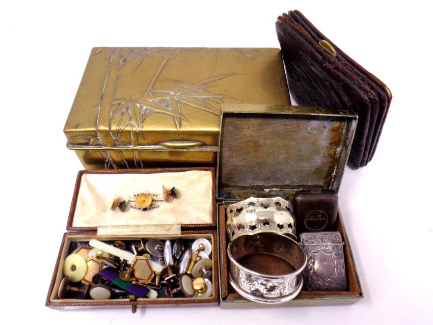 Two brass cigarette boxes containing silver Vesta case, silver and plated napkin rings, dress studs, leather wallet, three 9ct gold backed studs etc