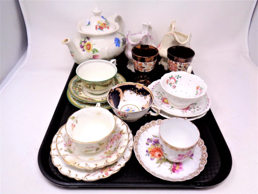 A tray containing a Saddler teapot, pair of copper lustre goblets, antique and later tea cups and saucers