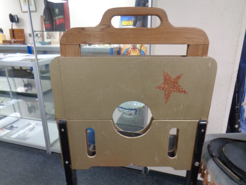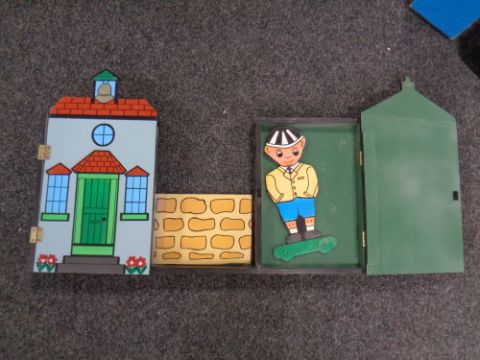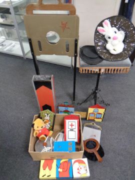 A collection of 20th century vintage magicians tricks, props and accessories to include magicians stand, guillotine, collapsible top hat, bird box, rabbit in hat, Sooty etc