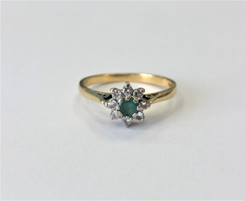 An 18ct gold emerald and diamond cluster ring, size O