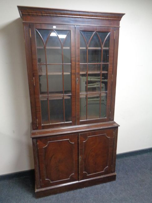 A mahogany double door glazed bookcase fitted cupboards beneath