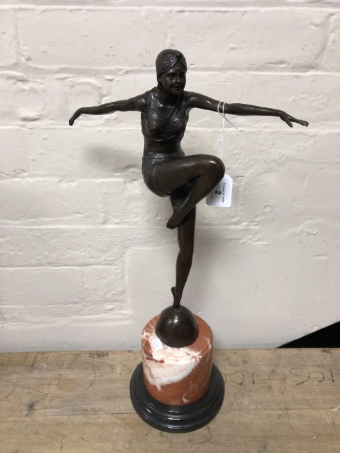 An Art Deco style bronze figure of a dancer on marble and turned wooden plinth, height 56 cm.