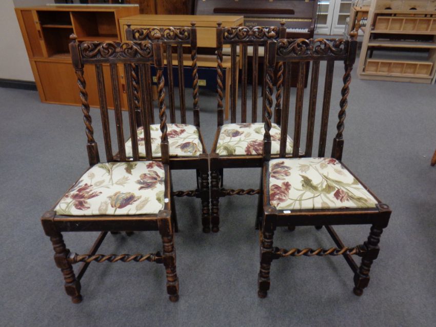A set of four Edwardian oak barley twist dining chairs
