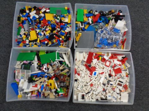 A plastic four drawer storage chest containing a large quantity of Lego
