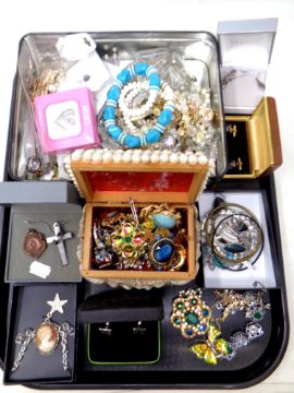 A tray of assorted costume jewellery, gent's cuff links, football medal, cameo brooch etc