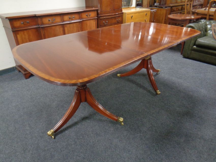 A Regency style twin pedestal extending dining table, with leaf, eight brass inlaid dining chairs and matching break-front sideboard