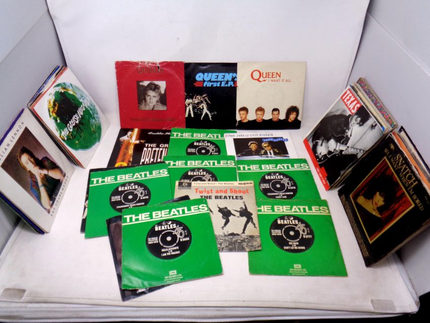 A box of seven inch singles, Beatles, Queen etc