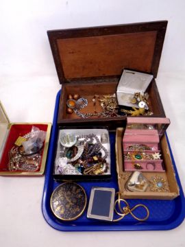 A tray of jewelry boxes containing costume jewelry, small silver photo frame, compact etc
