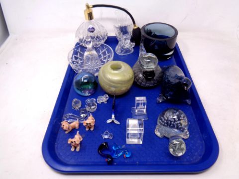A tray of assorted glass ware, Swarovski and other glass animal ornaments (as found), paperweight, Edinburgh crystal etc