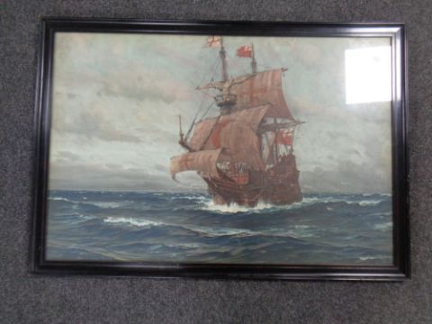 A framed print of a sailing ship in an ebonised frame