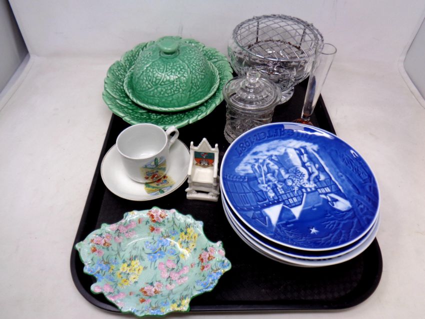 A tray of Shelley floral dish, Bing & Grondahl blue and white plates, Sylvac muffin dish with cover, matching comport etc