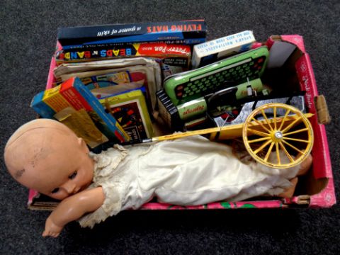 A box of vintage games and puzzles, Mattoy Super Type tin plate typewriter, vintage doll etc
