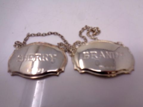 Two silver decanter labels - sherry and brandy