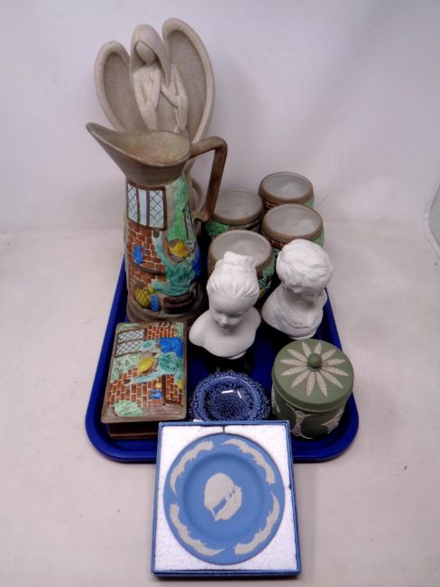 A tray of J Wood Burslem jug with four matching goblets, lidded trinket box, pair of busts, Wedgwood Jasperware, Leonardo Collection figure etc