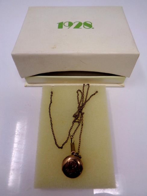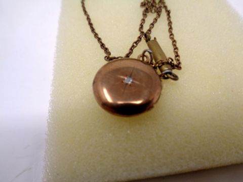A late 19th century 9ct gold locket, with small round old cut diamond to centre, opening to reveal two glazed compartments on yellow metal chain.