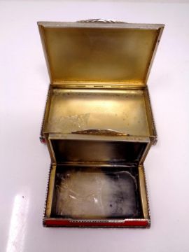 An American Art Deco enamelled silver tobacco box / card box, red and black striped enamel with silver banding detail and gilt interior, together with a matching enamelled silver vesta case, both stamped Sterling with London import marks for PH Vogel & Co, 1926. (2)