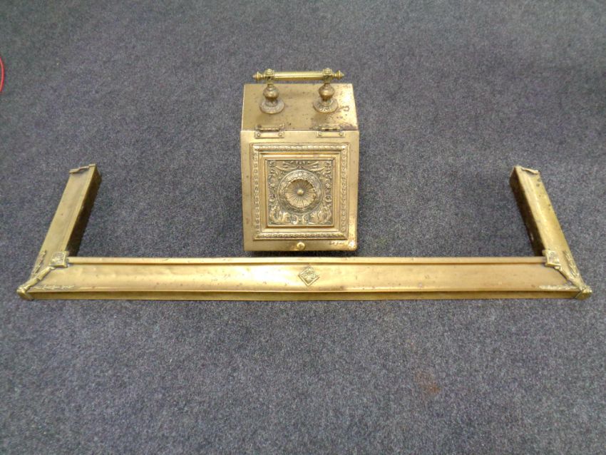 A 19th century brass embossed coal receiver together with a brass fire curb and copper & brass pot containing three companion pieces