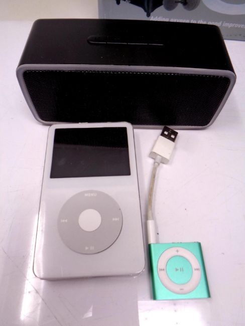 An Apple Ipod 60 gb, Blu tooth speaker, assorted headphones and leads