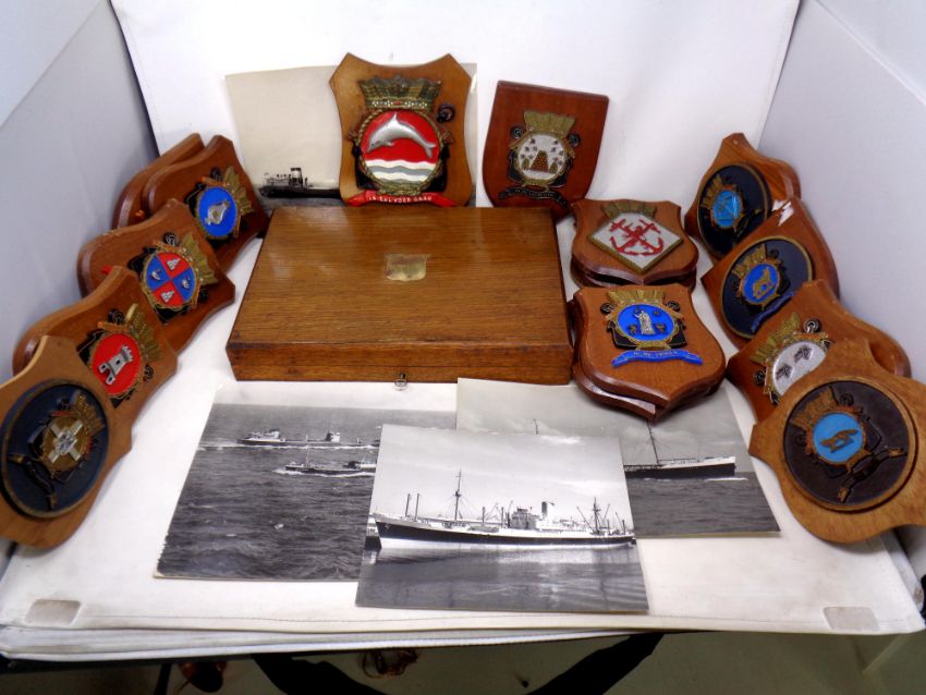 A box of assorted wooden ship's crest plaques, a quantity of photographs of ships and an antique wooden box with key