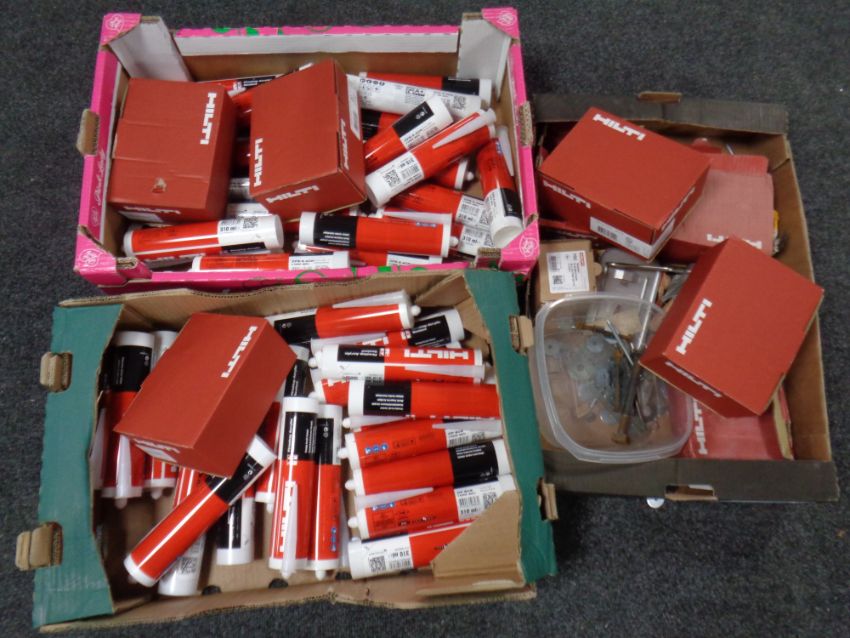 Three boxes of Hilti fire stop sealant, screws, washers etc