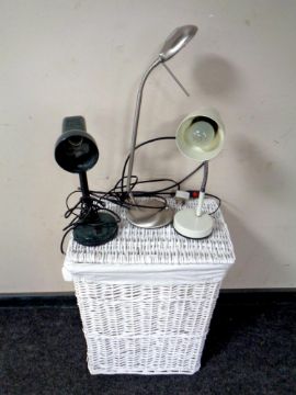 A box of knife block and knives, bowl of wooden fruit, cutlery, utensils, enamel twin handled dish, three graduated meat plates, wicker basket etc