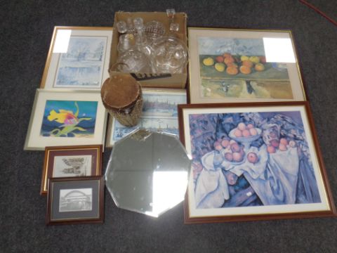 Two boxes of glassware, octagonal mirror, prints etc