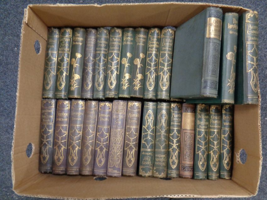 A box containing 31 twentieth century volumes with gilded spines, Thackeray, Dickens, poetry etc
