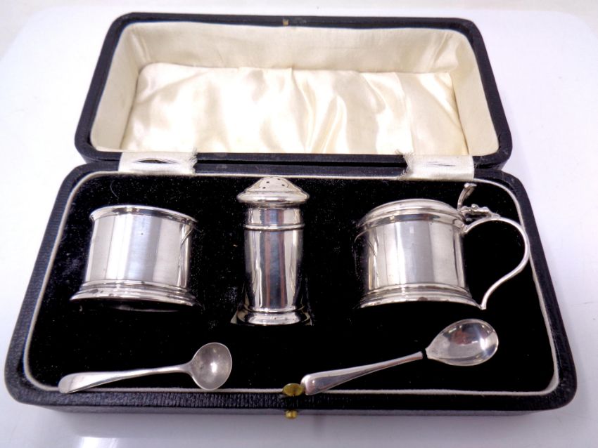 A silver three piece cruet set, Birmingham 1925, in original box with liners.