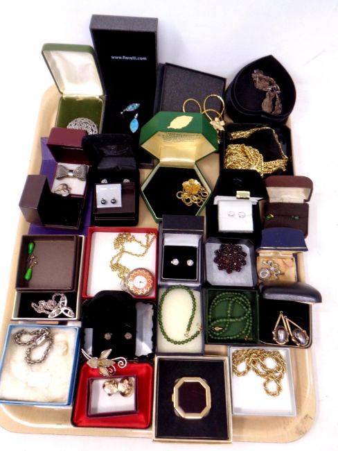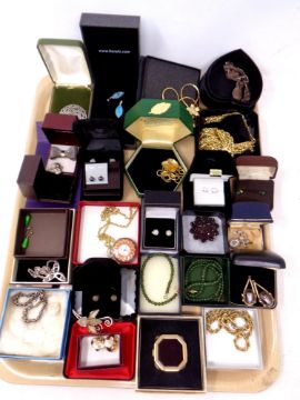 A tray of costume jewellery, bracelets, necklaces, earrings, brooches, heart pendant, fob watch on chain, boxed.