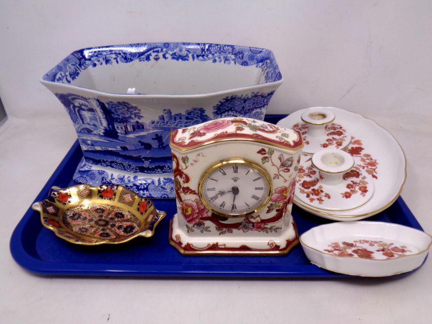 A tray of Spode Italian blue and white planter, Royal Crown Derby shaped Imari pattern dish, Masons Mandalay Red mantel clock, four pieces of Wedgwood Golden Cockerel china