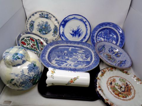 An antique transfer printed blue and white meat plate, further willow pattern plates, Aynsley Cottage Garden vase, Masons Fruit Basket lidded ginger jar