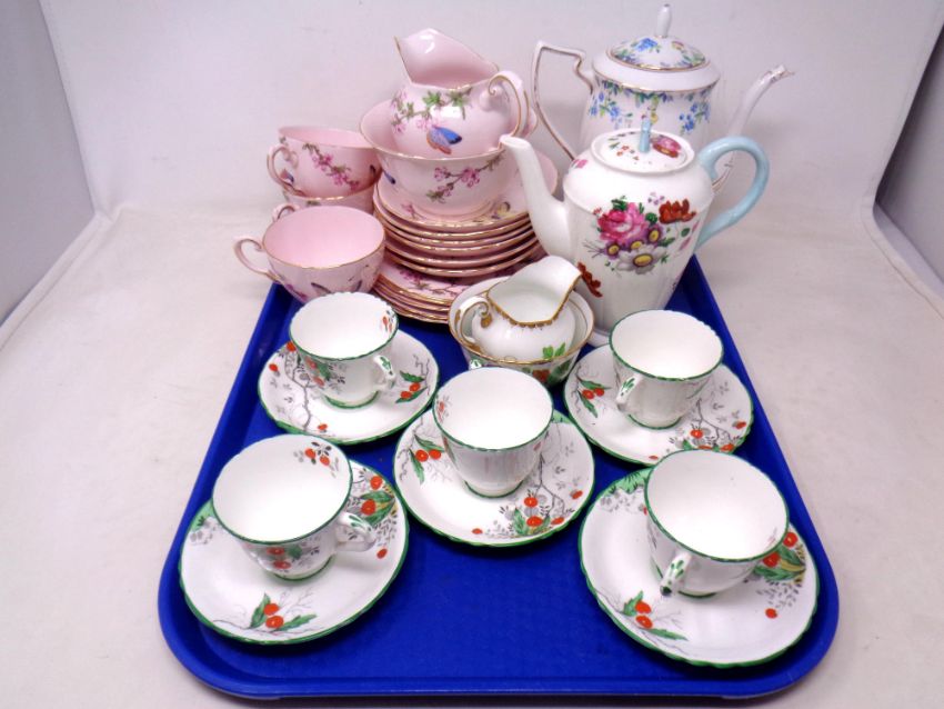 A tray of Tuscan and Delphine part china tea set, Duchess and Paragon tea pots