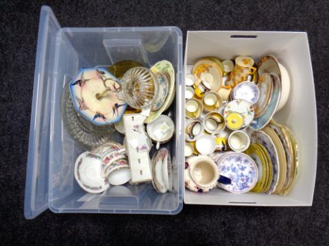 Two boxes containing 20th century pressed glass ware, Royal Doulton coffee china, dinner plates etc