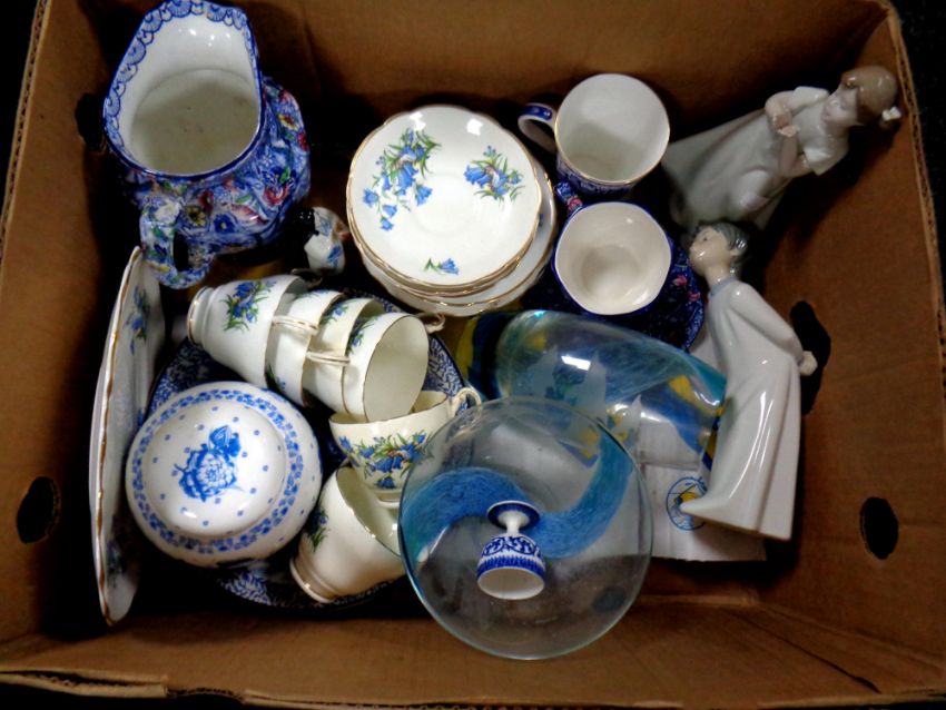 A box of Ringtons blue and white china, Regency harebell part tea set, Ringtons Maling chintz jug