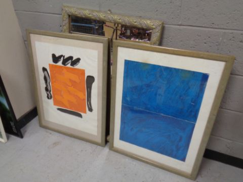 A decorative framed mirror and two framed prints