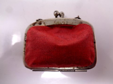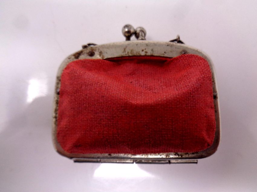 A vintage miniature purse containing silver three pence pieces.