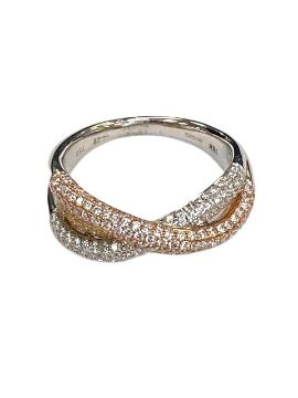 An 18ct rose, yellow and white gold pave set diamond cross over style ring, approximately 0.91ct, size N.