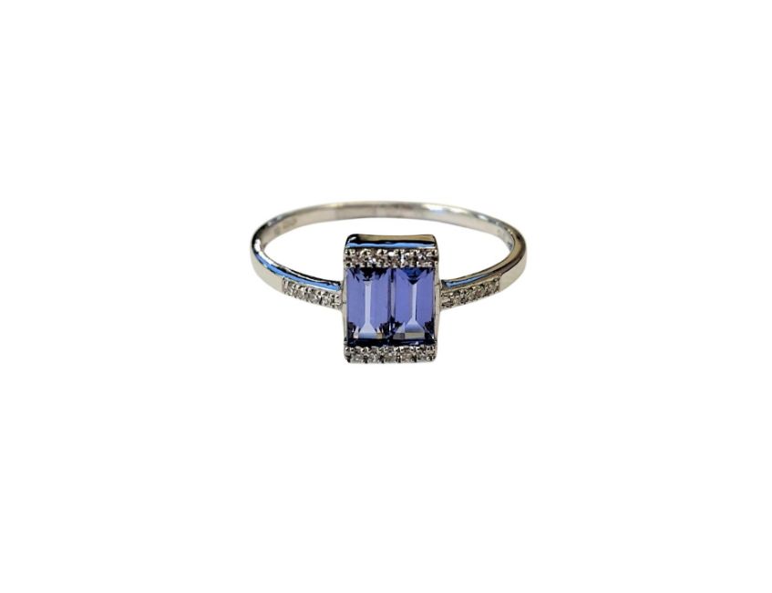 A 9ct white gold tanzanite baguettes and diamond ring, size O/P.