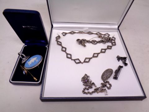 A box of silver marcasite jewellery, Jasperware brooch and ring etc