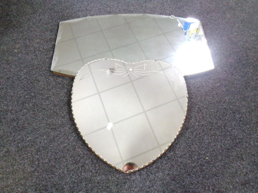 A frameless heart shaped mirror together with a similar mirror and a further Oriental lacquered oval mirror (af)