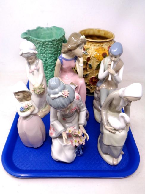 A tray of six Spanish figures, Sylvac jug and Indian Tree patterned vase