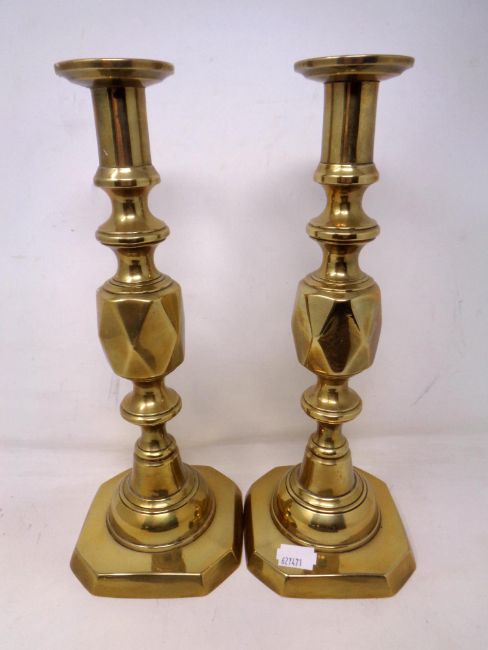 A pair of Queen of Diamonds brass candlesticks, height 29 cm.