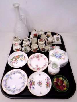 A tray of crested china, Moorcroft pin dish, porcelain dishes including Aynsley, Minton etc